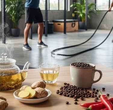 Café, chá verde e guaraná influenciam diretamente hormônios como adrenalina e noradrenalina, que elevam o gasto energético.